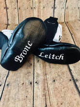 These baby cowboy boots are made with a Bronc Rider logo on the front with a white background and Black sides. The toe and sole are black faux leather. They are lined on the inside with felt for extra comfort. __________________________________________________________________