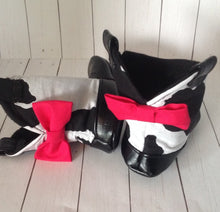 18-24 Month (6") _____________________________________________________________ These baby cowboy boots are made with Black & White cotton Cow Print shaft and black faux leather on the toe and sole. The inside is lined with felt for extra comfort. The bows are done in hot pink but can be done in other colors upon request. ______________________________________________________________ PERSONALIZATION ($10 more) Please email info.