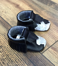 These baby shoes are made with Black and White Cow Print fabric on the toe (print placement on toe may vary due to cut of fabric). The Faux leather is a black. Non-slip soles are also an option if chosen for an extra amount.
