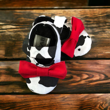 Baby girl shoes made with cow print cotton on the outside and felt on the inside for extra comfort. There is hook-and-loop on the strap for securing. The bows are red.