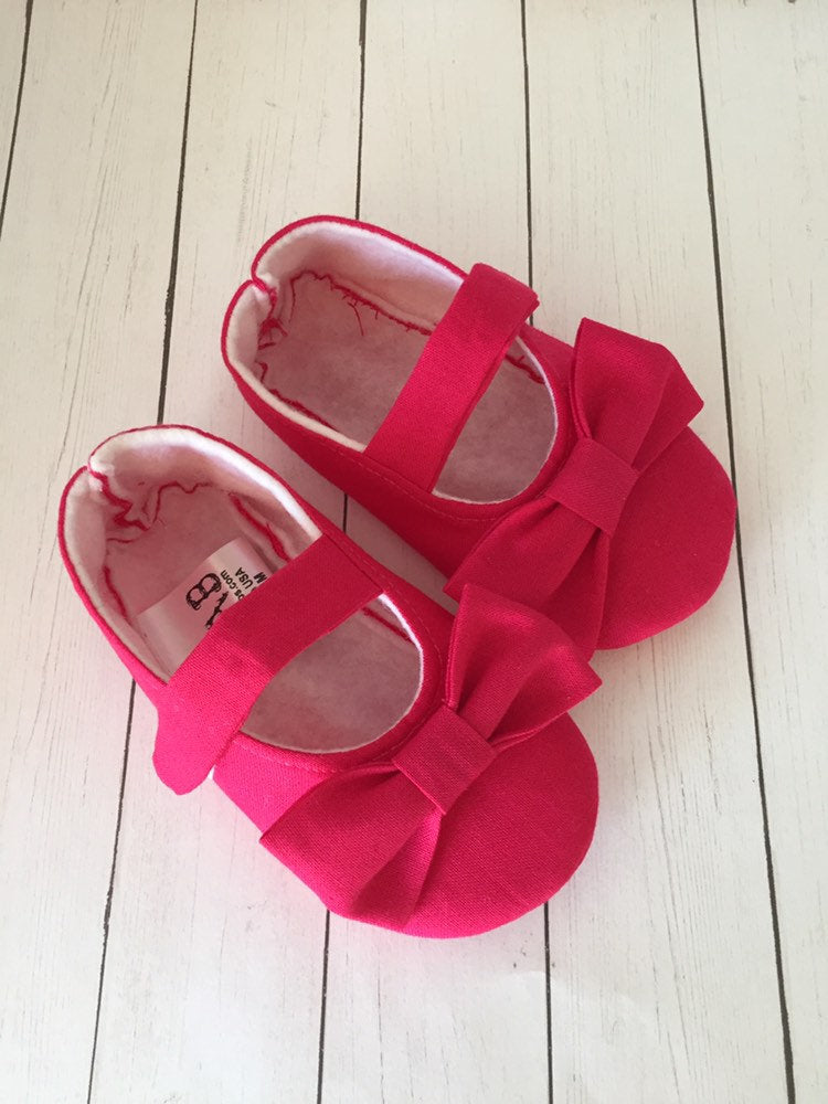 _______________________________________________________________________ Baby girl shoes made with Hot Pink cotton on the outside and felt on the inside for extra comfort. There is hook-and-loop on the strap for securing. ________________________________________________________________________ PERSONALIZATION ($5 more) > Name or Initials > Color > Lowercase or UPPERCASE _______________________________________________________________________ NON-SLIP SOLES ($2 more) > Black WANT A DIFFERENT COLOR OF SHOE OR BOW? Just send me a message and let me know!