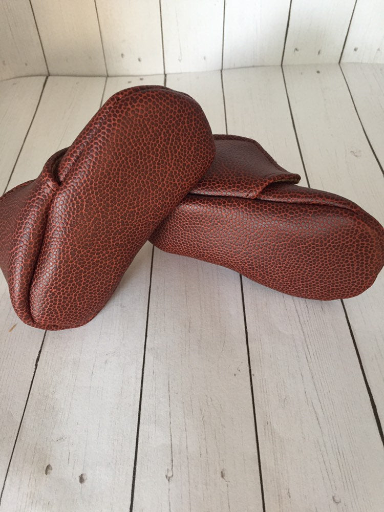 12-18 Month (5") _________________________________________________________________ Baby boy or girl shoes are made with soft football leather on the outside and lined on the inside with soft felt for extra comfort. Also with white elastic across the top. ________________________________________________________________ PERSONALIZATION ($10 more) Please email info.